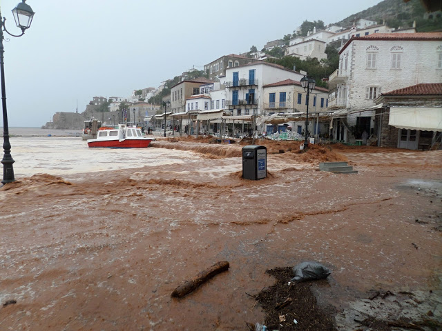 Όπως φαίνεται και στα παρακάτω βίντεο του hydraspoliteia.blogspot.gr, οι χείμαρροι παρέσυραν ό,τι έβρισκαν μπροστά τους με το νησί να θυμίζει βομβαρδισμένο τοπίο.
