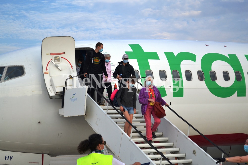 145 επιβάτες κατεβαίνουν από το αεροσκάφος φορώντας προστατευτικές μάσκες και τους υποδέχονται ο Γενικός Γραμματέας Υπουργείου Οικονομικών Χρήστος Τριαντόπουλος, ο αερολιμενάρχης Κώστας Ευσταθίου, ο πρόεδρος της Ένωσης Ξενοδόχων Μαγνησίας και εκπρόσωποι των συλλόγων Ξενοδόχων από Φθιώτιδα, Εύβοια και Πιερία.