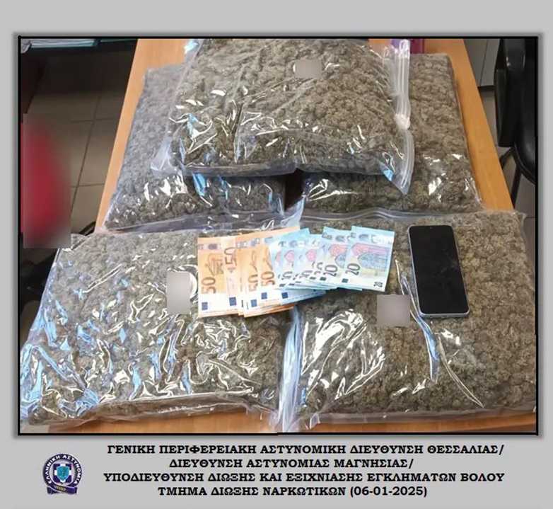 Ειδικότερα, χθες το βράδυ, οι αστυνομικοί προέβησαν σε έλεγχο του προαναφερόμενου, ο οποίος αποβιβάστηκε από υπεραστικό λεωφορείο και παρέλαβε ταξιδιωτικό σάκο από τον χώρο αποσκευών, κατά τον οποίο βρέθηκαν μέσα στο σάκο -5- νάιλον συσκευασίες με ποσότητες ακατέργαστης κάνναβης, συνολικού βάρους -5.189- γραμμαρίων, οι οποίες κατασχέθηκαν.