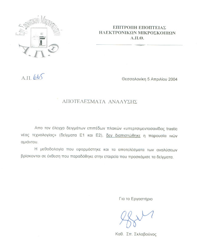 Αναζητώντας στο ιστολόγιο της εταιρείας μπορεί να βρει ένα έγγραφο του 2004 βάσει του οποίου δεν προκύπτει παρουσία ινών αμιάντου, μετά από ανάλυση που έγινε σε δείγμα που απέστειλε η εταιρεία. Βέβαια, ο κ. Θεοδωρίδης απορεί πώς η ανάλυση στηρίχτηκε σε δείγμα που απέστειλαν οι ίδιοι οι υπεύθυνοι του εργιαστασίου και δεν το έλαβε κάποιο ειδικό κλιμάκιο.