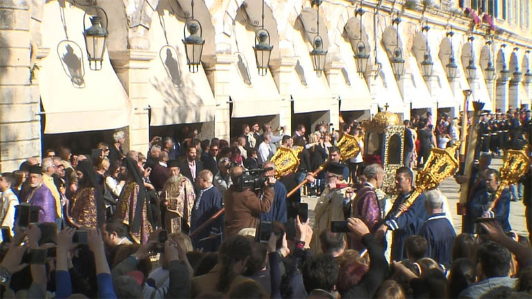 Η Κέρκυρα, φόρεσε ήδη τα γιορτινά της και ντύθηκε στα κόκκινα, αναμένοντας το βράδυ, όπου θα γίνει και η αποκορύφωση των θρησκευτικών δρώμενων, του Πάσχα. Ορθόδοξοι και Καθολικοί θα συγκεντρωθούν στο «Πεντοφάναρο» για να υποδεχθούν το Άγιο Φως που θα μεταφερθεί από τον καθολικό Αρχιεπίσκοπο στο Duomo και μετά από τον ορθόδοξο Μητροπολίτη, στον Ιερό Ναό της Αγίας Παρασκευής, όπου και θα αρχίσει και η «Ακολουθία της Αναστάσεως του Κυρίου». Μετά το πέρας των Ακολουθιών, λίγα λεπτά πριν τις 12.00, θα ξεκινήσει η πομπή των Ορθοδόξων και των Καθολικών με σημείο συνάντησης το «Πάλκο» της Πάνω Πλατείας Σπιανάδας.