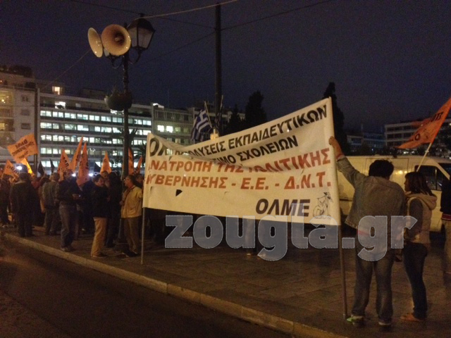 Συγκέντρωση διαμαρτυρίας πραγματοποιούν αυτήν την ώρα στην πλατεία Συντάγματος εκπαιδευτικοί που έχουν ήδη τεθεί σε καθεστώς διαθεσιμότητας.