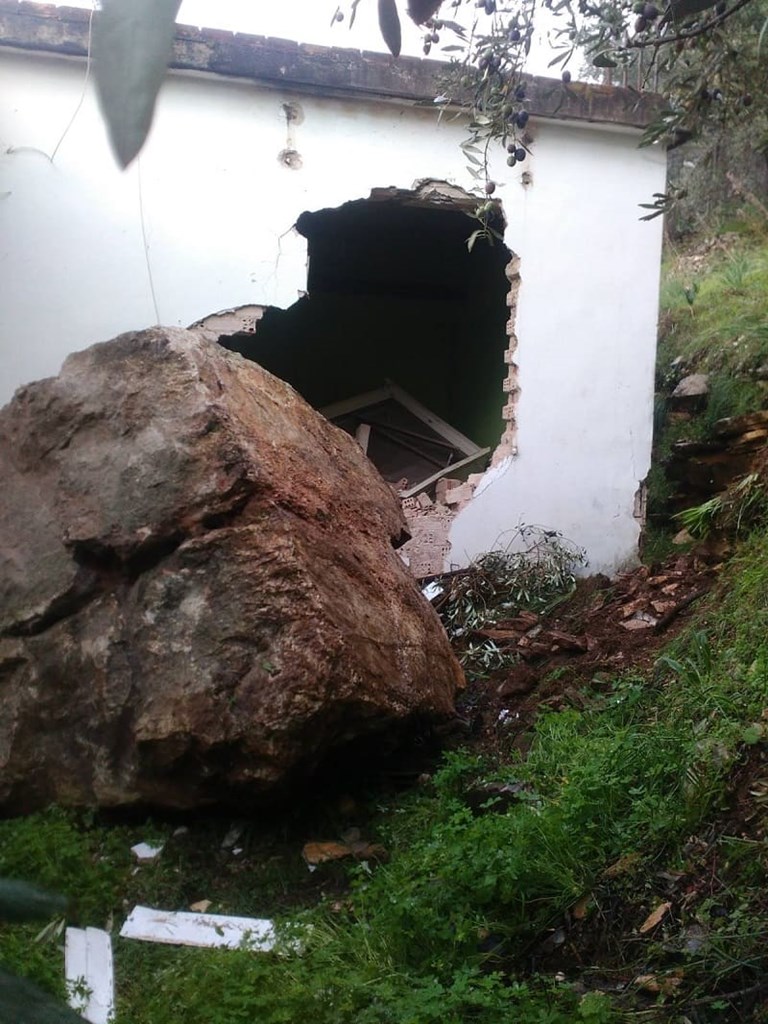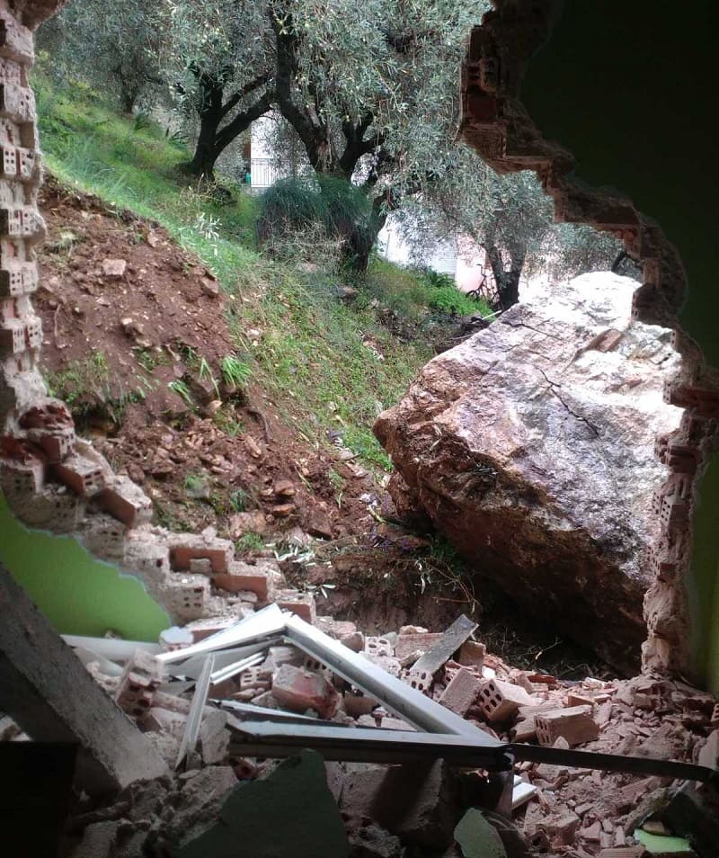 Ο βράχος χτύπησε με δύναμη τον τοίχο του σπιτιού, την ώρα που μέσα βρίσκονταν μια γυναίκα με τον γιο της, ευτυχώς από την αντίθετη πλευρά, στην κουζίνα. Ο τοίχος κατέρρευσε και προκλήθηκαν ζημίες στα δωμάτια.