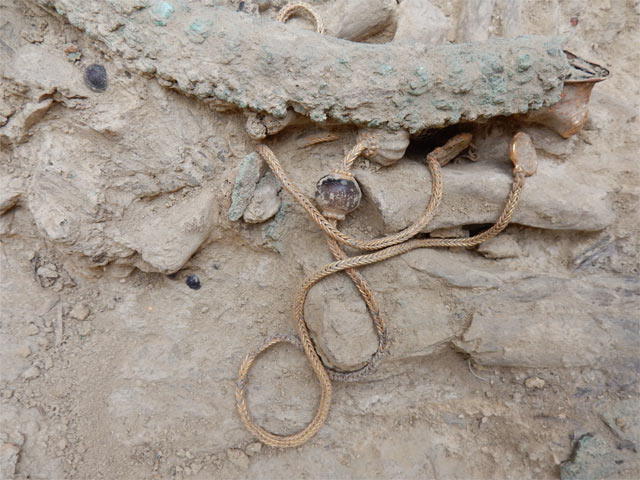 Όπως αναφέρεται στην ανακοίνωση του Υπουργείου Πολιτισμού «στο δάπεδο του τάφου, βρέθηκε σε στάση εκτάδην ο σκελετός ενός ενήλικα άνδρα, τοποθετημένου σε ξύλινο φέρετρο. Όπλα βρέθηκαν στην αριστερή πλευρά του και στο ύψος των ποδιών, κοσμήματα στην δεξιά πλευρά, ενώ, κοντά στο λαιμό, μια μοναδική και θαυμάσια διατηρημένη χρυσή αλυσίδα και χρυσά κύπελλα είχαν αποτεθεί επάνω στο στήθος και στο στομάχι του νεκρού».