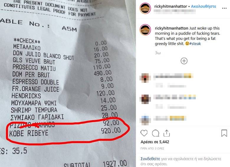 Ο ίδιος πόσταρε την απόδειξε στα social media και σχολίασε σχετικά: «Μόλις ξύπνησα με δάκρυα, αυτά παθαίνεις όταν είσαι άπληστος».