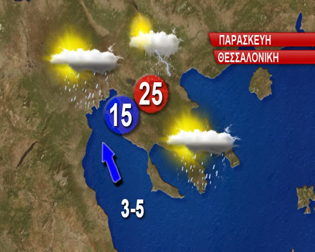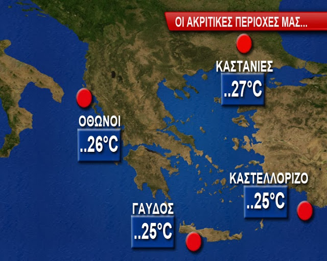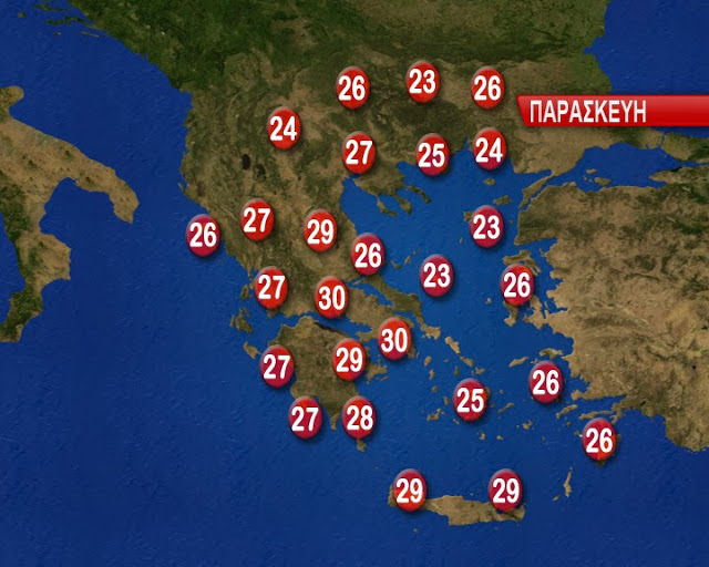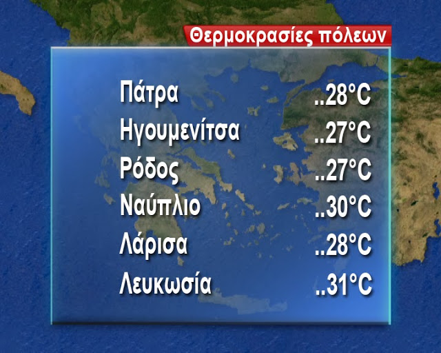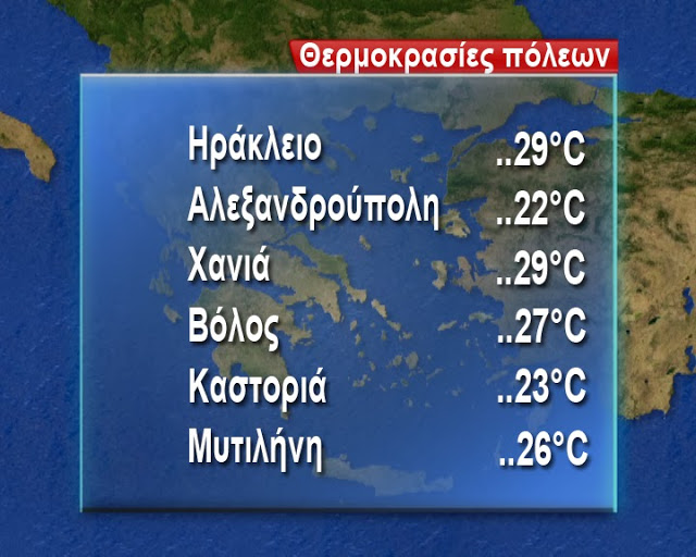 Η θερμοκρασία θα κυμανθεί από 7 έως 24 βαθμούς στη Βόρεια Ελλάδα, από 16 έως 26 στη Δυτική Ελλάδα, από 12 έως 28 βαθμούς στην Κεντρική Ελλάδα, από 16 έως 28 στη Νότια Ελλάδα, από 16 έως 31 βαθμούς στα ανατολικά ηπειρωτικά και από 17 έως 26 βαθμούς στα νησιά του Αιγαίου, με τις μέγιστες στην Κρήτη να είναι 2 με 3 βαθμούς υψηλότερες.