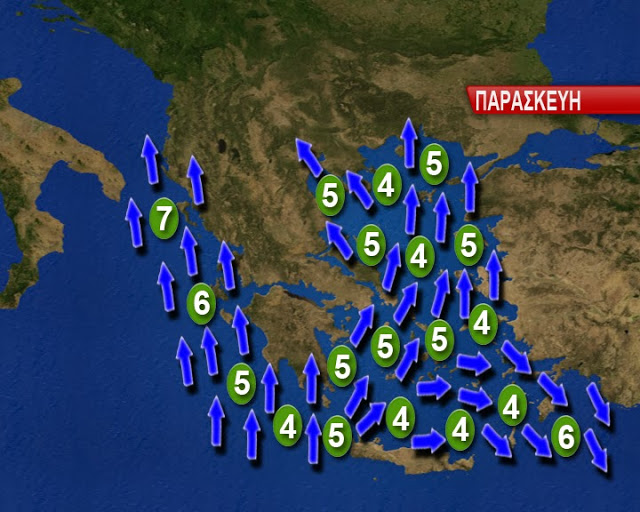 Οι άνεμοι στο Αιγαίο θα πνέουν από διάφορες διευθύνσεις ασθενείς μέχρι μέτριοι εντάσεως 4-6 μποφόρ, αλλά στα νοτιοανατολικά πελάγη θα επικρατήσουν μέτριοι έως ισχυροί βορειοδυτικοί άνεμοι. Στο Ιόνιο οι άνεμοι θα πνέουν νότιοι-νοτιοανατολικοί μέτριοι μέχρι ισχυροί.
