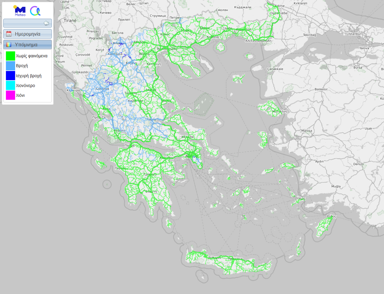 Στην παρακάτω εικόνα με μπλε και γαλάζιες αποχρώσεις χρωματίζονται οι οδικές οδοί όπου αναμένονται βροχοπτώσεις και καταιγίδες.