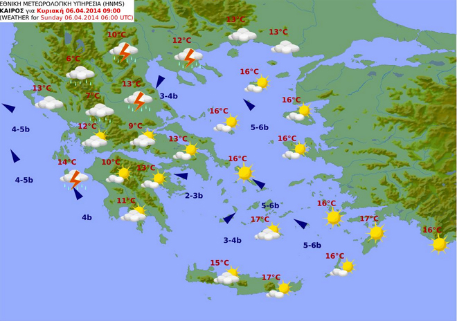 Άνεμοι: Νότιοι νοτιοανατολικοί 3 με 5 και στα ανατολικά τοπικά 6 Μποφόρ.