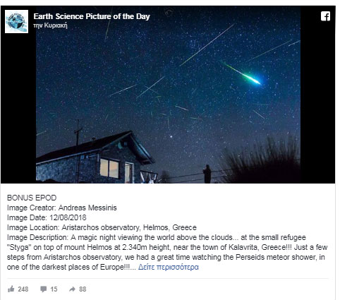 «Μια μαγική βραδιά ατενίζοντας τον κόσμο που βρίσκεται πάνω από τα σύννεφα… στο μικρό καταφύγιο “Στύγα” στην κορυφή του όρους Χελμός, σε ύψος 2.340 μ., κοντά στην πόλη Καλάβρυτα στην Ελλάδα!!! Μόλις λίγα βήματα από το Παρατηρητήριο “Αρίσταρχος”, περάσαμε υπέροχα βλέποντας τις Περσείδες, βροχή μετεωριτών, σε ένα από τα πιο σκοτεινά μέρη της Ευρώπης» ήταν το σχόλιο-περιγραφή που συνόδευσε τη φωτογραφία.
