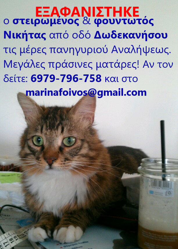 Χάθηκε γάτος από την οδό Δωδεκανήσου στα Βριλήσσια. Είναι φουτωτός με χαρακτηριστικά μεγάλα πράσινα μάτια...