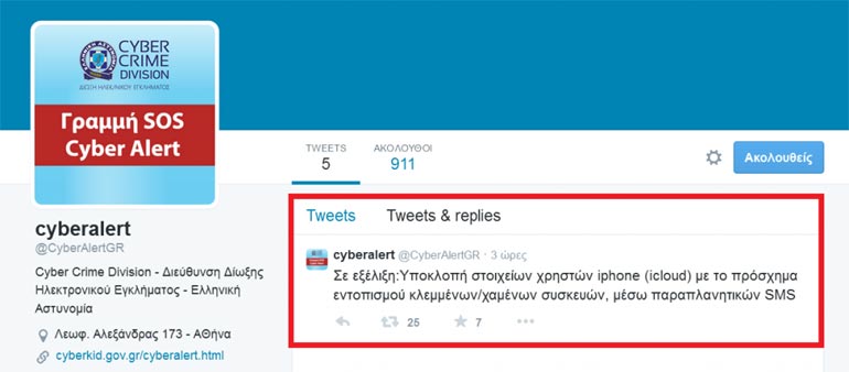 Από σήμερα, η Διεύθυνση Δίωξης Ηλεκτρονικού Εγκλήματος άνοιξε λογαριασμό στο twitter με την ονομασία «cyberalertGR».