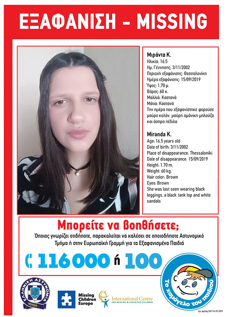 Ένα κορίτσι 16,5 ετών εξαφανίστηκε από την πόλη της Θεσσαλονίκης την Κυριακή 15 Σεπτεμβρίου, στις 18:00. Για την εξαφάνιση της Μιράντας Κ., ενημερώθηκε το Χαμόγελο του Παιδιού σήμερα Δευτέρα, κατά τις απογευματινές ώρες, όταν έλαβε τα απαραίτητα στοιχεία του παιδιού.