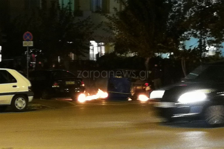 Στην αρχή της οδού, διαδηλωτές έκαψαν κάδο απορριμμάτων του δήμου και άρχισαν να πετάνε προς την πλευρά της οδού Ελευθερίου Βενιζέλου πέτρες και βόμβες μολότοφ, προκαλώντας την επέμβαση της αστυνομίας που κινήθηκε προς το μέρος τους.