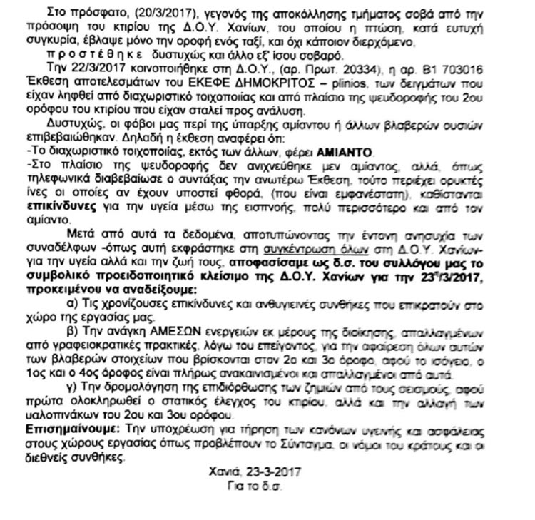 Ο Σύλλογος Εργαζομένων ΔΟΥ Χανίων εξέδωσε ανακοίνωση, στην οποία αναφέρει ότι: