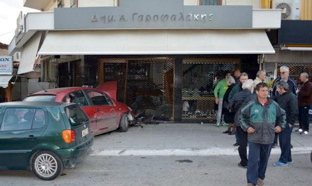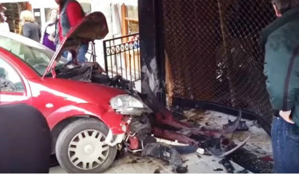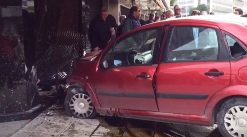 Στο πέρασμά του το Ι.Χ παρέσυρε έναν πεζό νεαρό άντρα και μετά «καρφώθηκε» στην είσοδο του κοσμηματοπωλείου, προκαλώντας αρκετές υλικές ζημιές.