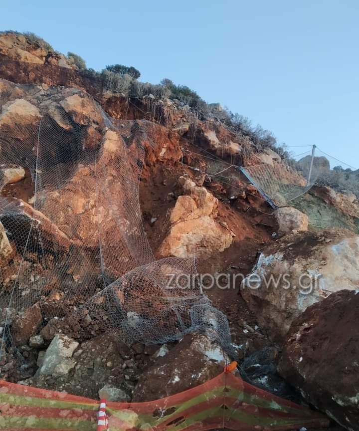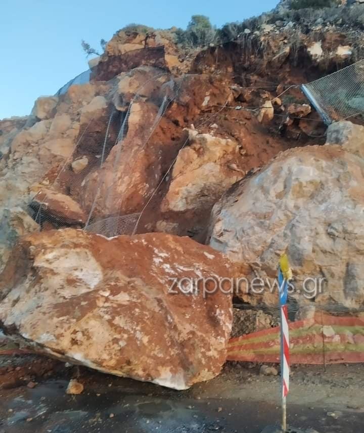 Ένας τεράστιος βράχος αποκολλήθηκε από το βουνό στην περιοχή του Ψηλού Βόλακα, στην Παλαιόχωρα Χανίων, έσκισε τα προστατευτικά σύρματα και έπεσε στο δρόμο, ευτυχώς χωρίς δυσάρεστες συνέπειες.