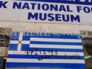 Τις λέξεις «φασίστες καραγκιόζηδες» και ένα «Χ» τόλμησαν να γράψουν κάποιοι βέβηλοι πάνω στην ελληνική σημαία που βρίσκεται στην πρόσοψη του Μουσείου της Εθνικής Ομάδας – Γαλανόλευκος Φάρος, στην οδό Τσουδερών στα Χανιά.