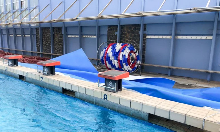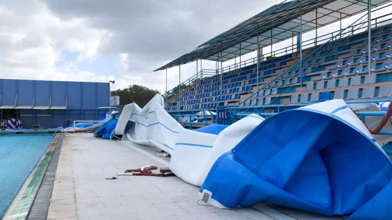 Σύμφωνα με την ανακοίνωση του ΝΟΧ, «το ένα μέρος της “κουβέρτας” που σκεπάζει την 50άρα πισίνα έχει ξηλωθεί στην κυριολεξία, με αποτέλεσμα μετά από προσπάθειες που έγιναν να δεθεί με σκοινί στα κάγκελα που βρίσκονται στις εξέδρες του κολυμβητηρίου».