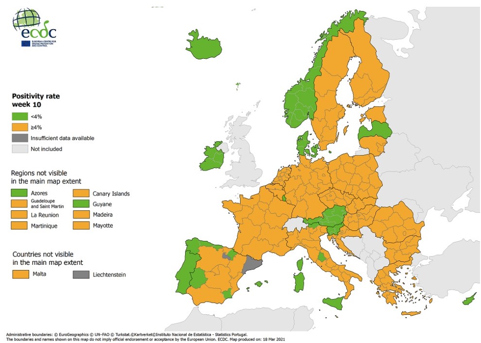 Στο δείκτη θετικότητας, η Ελλάδα βρίσκεται στο «κίτρινο» όπως και οι περισσότερες ευρωπαϊκές χώρες. Δηλαδή, στο σύνολο της επικράτειας ο δείκτης θετικότητας είναι ίσος ή μεγαλύτερος από το όριο συναγερμού του 4%.