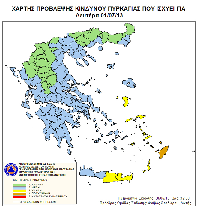 Σύμφωνα με τον Χάρτη Πρόβλεψης Κινδύνου Πυρκαγιάς που εξέδωσε η Γενική Γραμματεία Πολιτικής Προστασίας του Υπουργείου Δημόσιας Τάξης και Προστασίας του Πολίτη για σήμερα, Δευτέρα 1 Ιουλίου 2013, προβλέπεται υψηλός κίνδυνος πυρκαγιάς (κατηγορία κινδύνου 3) για τις περιοχές που φαίνονται στον ακόλουθο χάρτη: