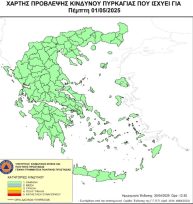 Σημειώνεται ότι ο πρώτος Χάρτης, που εκδόθηκε σήμερα, αφορά στην αυριανή, πρώτη μέρα της αντιπυρικής περιόδου. Σύμφωνα με το Χάρτη, αύριο ο βαθμός επικινδυνότητας έναρξης πυρκαγιάς είναι χαμηλός, κατηγορίας «1» (πράσινο).