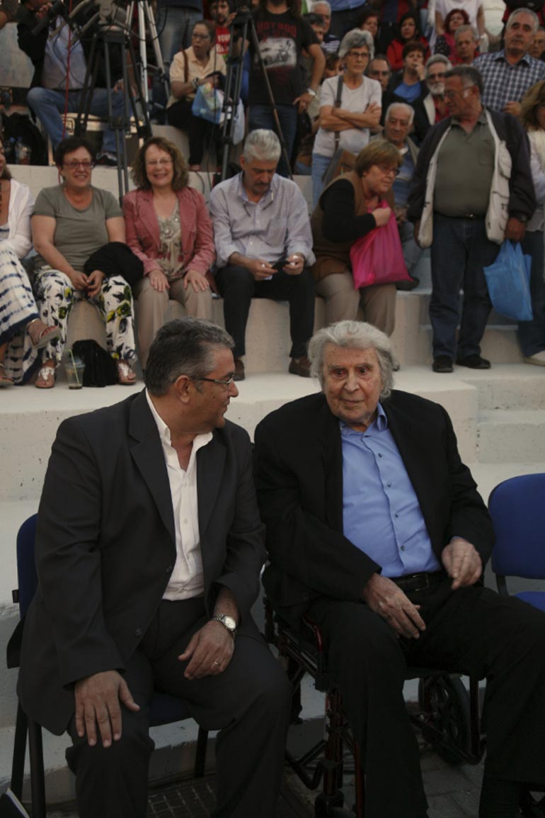 Ο μεγάλος δημιουργός αφιέρωσε την αποψινή εκδήλωση στον Χαρίλαο Φλωράκη. Τόνισε τους διαχρονικούς δεσμούς φιλίας και συντροφικότητας με τον ιστορικό ηγέτη του ΚΚΕ, με τον οποίο, όπως είπε, σε διάφορες μεταγωγές από φυλακή σε φυλακή, οι δέσμοφυλακές τους τους έδεναν με τις ίδιες χειροπέδες.