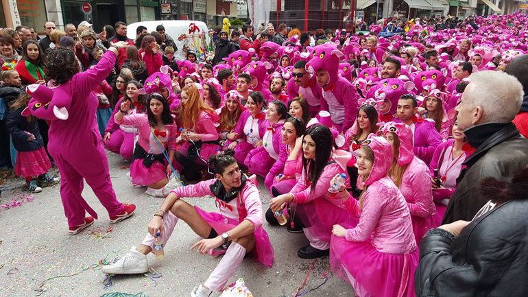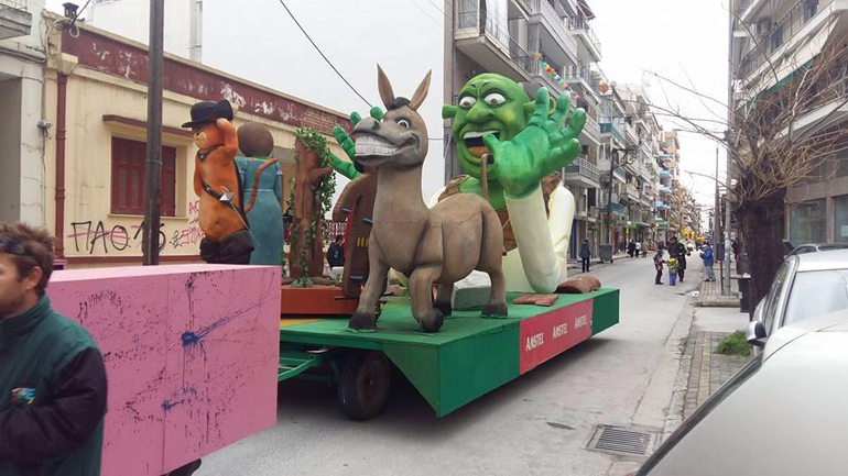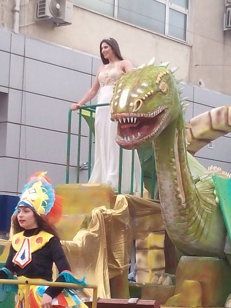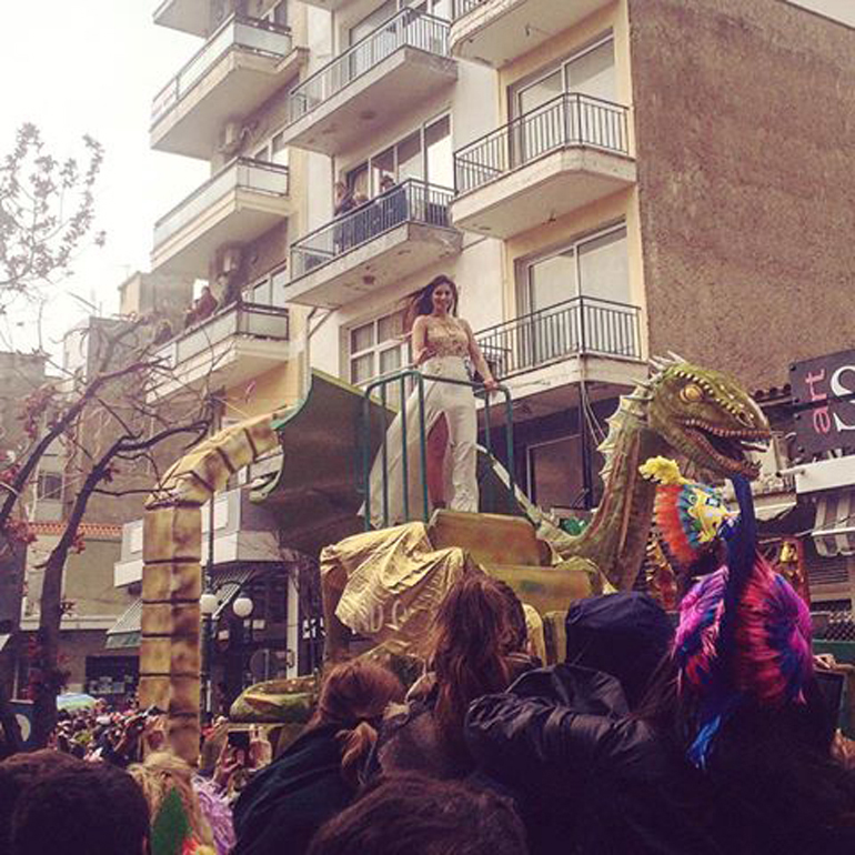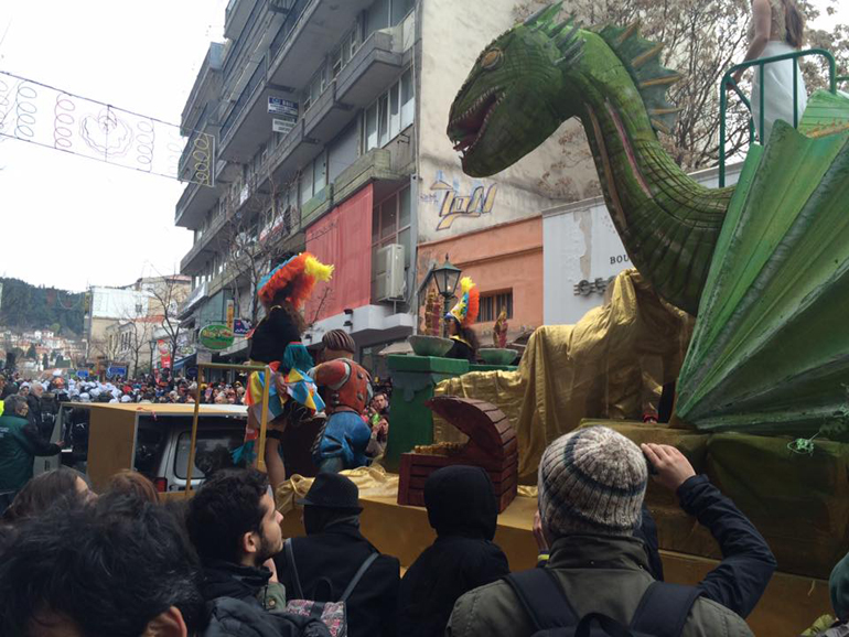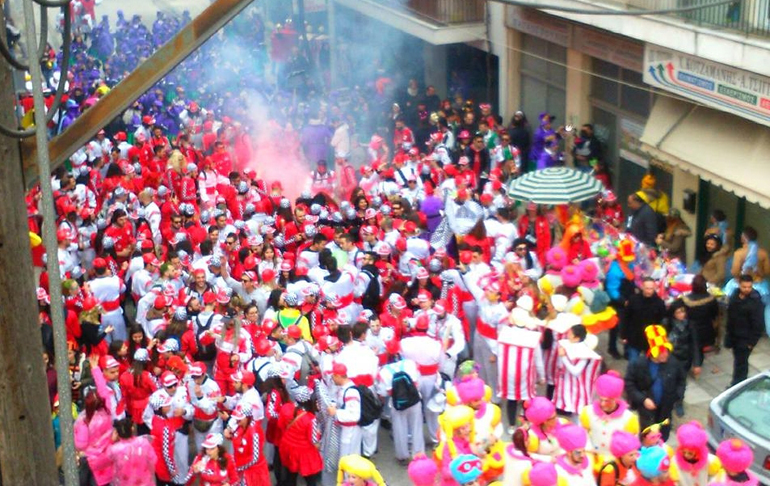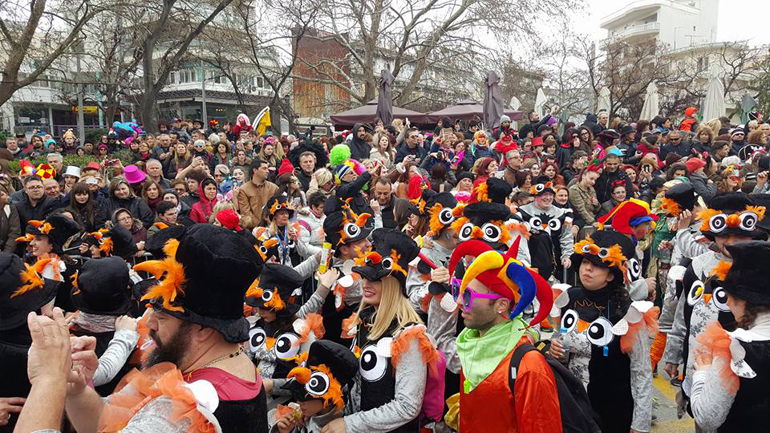 Ακολούθως οι καρναβαλιστές κατευθύνθηκαν χορεύοντας προς την Κεντρική Πλατεία της πόλης, με το άρμα του Βασιλιά Καρνάβαλου και τη Βασίλισσα του Καρναβαλιού Κωνσταντίνα Καρκάνη να ανοίγουν την παρέλαση.