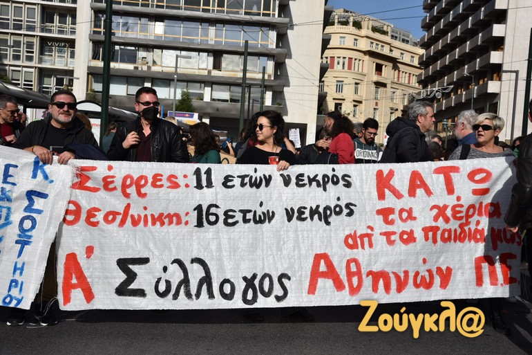 Ανάμεσα στα πανό που σήκωσαν οι παρευρισκόμενοι, ξεχώρισαν αυτά που έκαναν αναφορά στον 11χρονο μαθητή που έχασε τη ζωή του στο σχολείο των Σερρών αλλά και στον 16χρονο Ρομά, που πυροβολήθηκε θανάσιμα από τον αστυνομικό στη Θεσσαλονίκη.