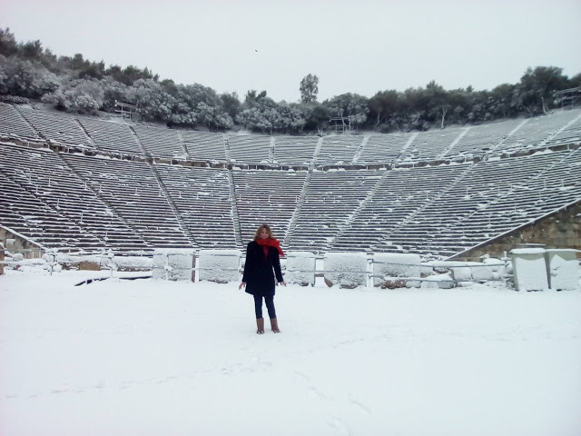 Πανέμορφες εικόνες από το χιονισμένο θέατρο της Επιδαύρου ανεβάζουν οι χρήστες στα social media.