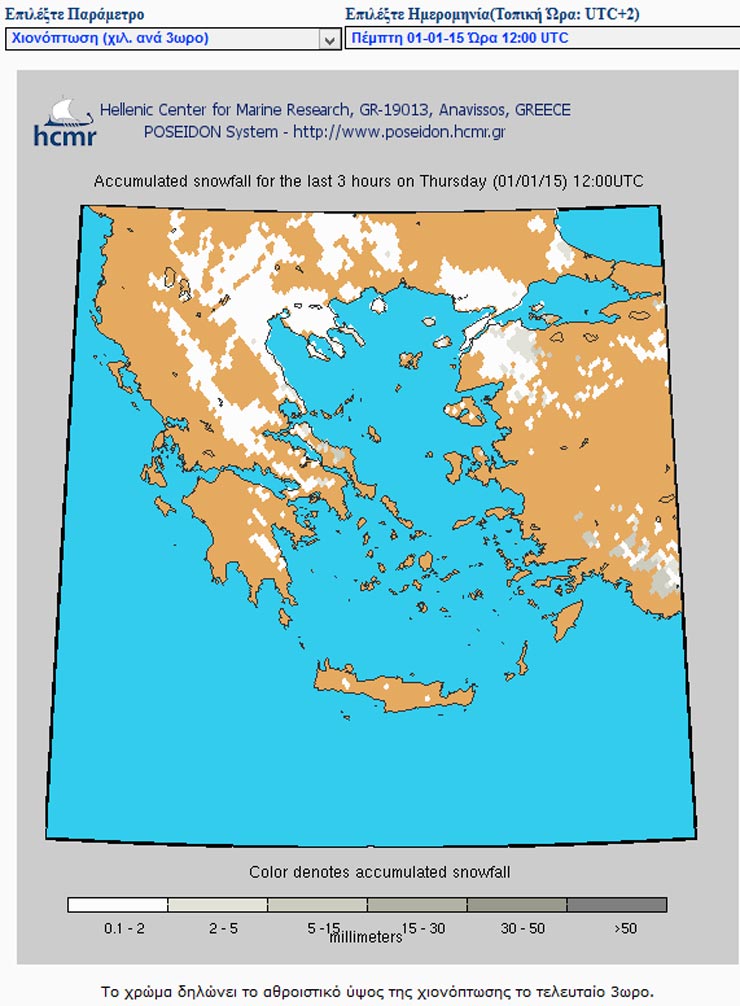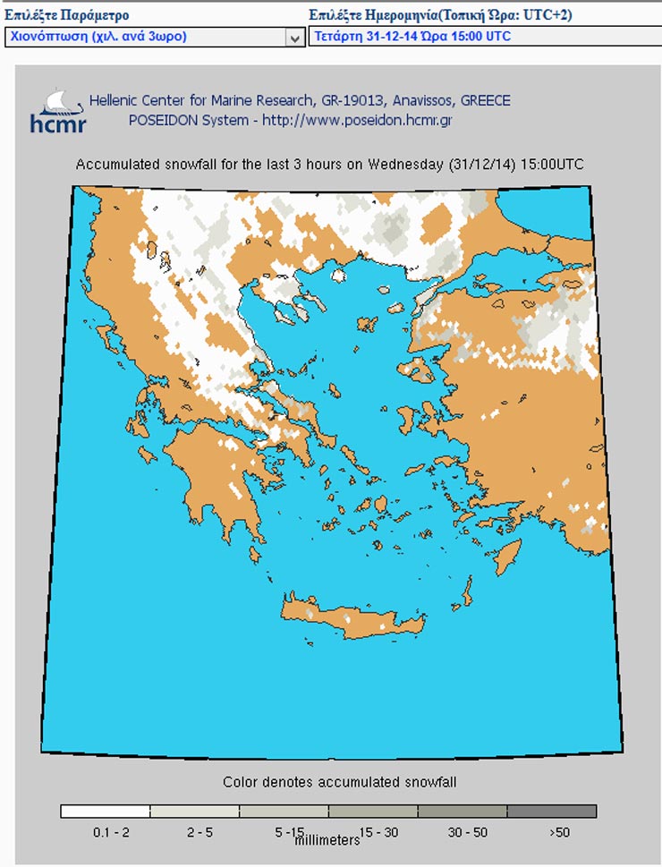Για την πρώτη ημέρα του 2015 προβλέπονται στα δυτικά και βόρεια λίγες νεφώσεις παροδικά αυξημένες τις πρωινές ώρες, με ασθενείς χιονοπτώσεις, κυρίως στην ανατολική Μακεδονία και τη Θράκη. Στην υπόλοιπη ηπειρωτική χώρα και την Εύβοια θα σημειωθούν νεφώσεις με παροδικές χιονοπτώσεις, ενώ στη νότια νησιωτική χώρα αναμένονται τοπικές βροχές και σποραδικές καταιγίδες αλλά και χιόνια στα ορεινά. Τα φαινόμενα βαθμιαία θα εξασθενήσουν. Οι άνεμοι στα νοτιοανατολικά θα πνέουν νοτιοδυτικοί 6 με 7 μποφόρ. Στις υπόλοιπες περιοχές βορειοανατολικοί 6 με 7 και στο Αιγαίο 8 με 9 και πιθανώς 10 μποφόρ, με βαθμιαία εξασθένηση από τη νύχτα. Η θερμοκρασία θα συνεχίσει να κυμαίνεται σε χαμηλά επίπεδα, ενώ ο παγετός στα ηπειρωτικά και στα βόρεια θα είναι ισχυρός.