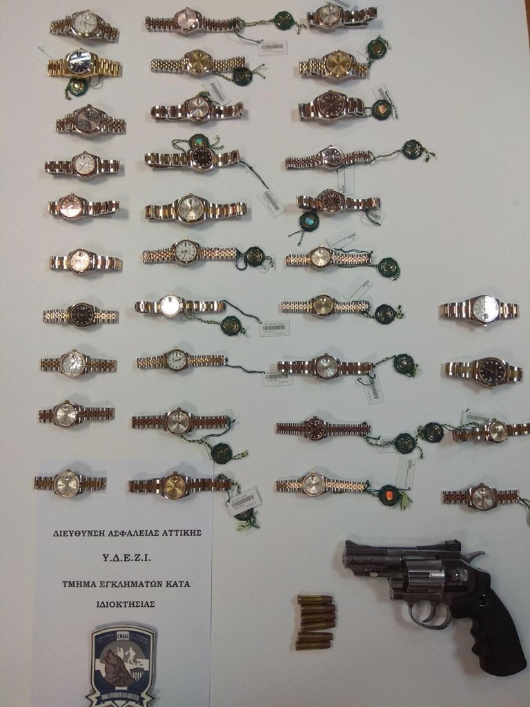 Σε έρευνα που διενεργήθηκε στο σπίτι του, βρέθηκαν και κατασχέθηκαν 34 από τα κλεμμένα επώνυμα ρολόγια, περίστροφο κρότου με πέντε αβολύδωτα φυσίγγια και πέντε στιλέτα.
