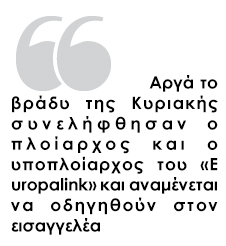 Όπως έγινε γνωστό, αργά το βράδυ της Κυριακής συνελήφθησαν στο νησί ο πλοίαρχος και ο υποπλοίαρχος του «Εuropalink», και σήμερα το πρωί οδηγήθηκαν στον εισαγγελέα, βάσει του άρθρου 277, 278 του Ποινικού Κώδικα, που αφορά πρόκληση προσάραξης πλοίου από αμέλεια με κίνδυνο για τους επιβάτες.