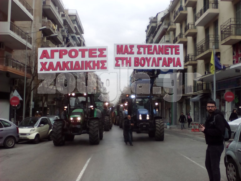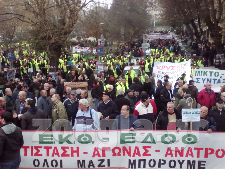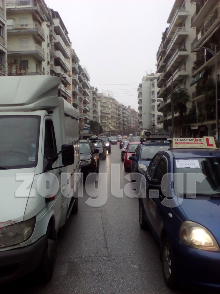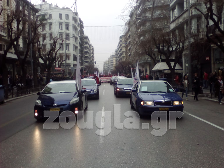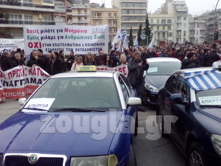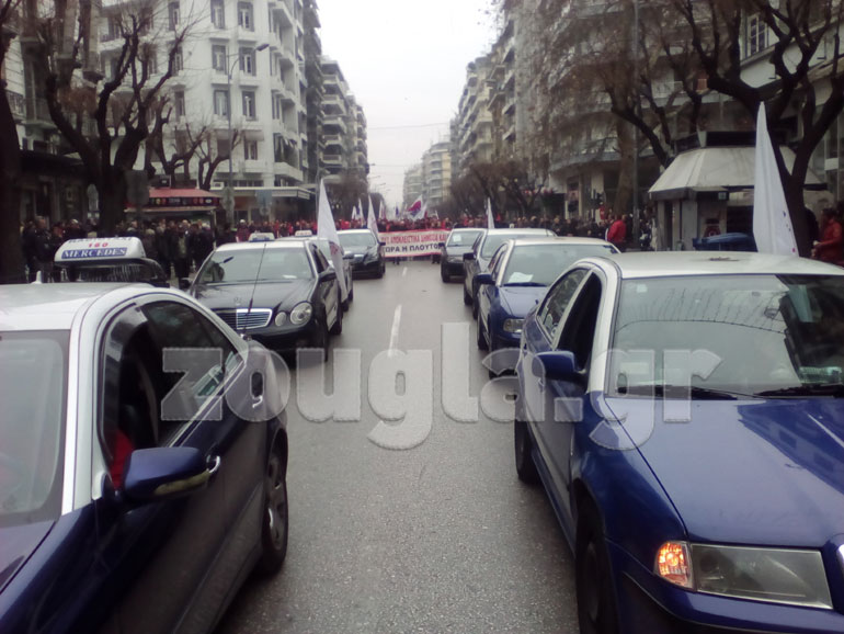 Στις 9 το πρωί οι επαγγελματίες προγραμμάτισαν διαμαρτυρία με τα αυτοκίνητα τους έξω από το κτήριο της Περιφέρειας Κεντρικής Μακεδονίας. Η πορεία ξεκίνησε από το κτήριο της Περιφέρειας, αναπτύχθηκε επί της Βασιλίσσης Όλγας, κατευθύνθηκε προς Τσιμισκή με τελική κατεύθυνση το Υπουργείο Μακεδονίας-Θράκης. Σε αυτή μετείχαν ιδιοκτήτες και οδηγοί ταξί, ιδιοκτήτες σχολών οδηγών, επαγγελματίες υδραυλικοί και βυτιοφορείς, ενώ λίγο μετά τις 11 την κινητοποίηση των επαγγελματιών ενίσχυσαν και οι αγρότες.