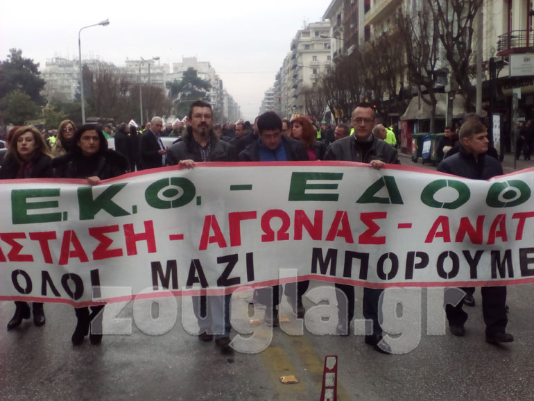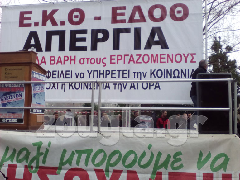 Το ΕΚΘ και η ΕΔΟΘ πραγματοποίησαν απεργιακή συγκέντρωση στις 10.30 π.μ. το πρωί έξω από το κτήριο του Εργατοϋπαλληλικού Κέντρου.
