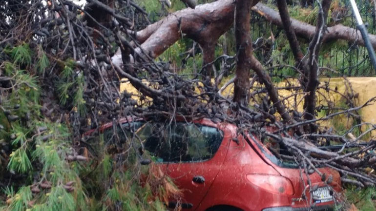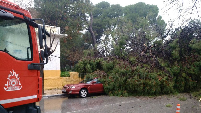Μεγάλα δέντρα έπεσαν στην οδό Πλουμιδάκη, στο πλάι του Δημοτικού Κήπου των Χανίων, προκαλώντας σοβαρές υλικές ζημιές σε τρία σταθμευμένα οχήματα.