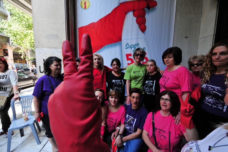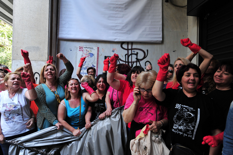 Χορό έστησαν έξω από το Υπουργείο Οικονομικών οι καθαρίστριες που είχαν απολυθεί ή τεθεί σε καθεστώς διαθεσιμότητας από την προηγούμενη κυβέρνηση και επαναπροσλήφθηκαν μετά από κινητοποιήσεις διαρκείας.