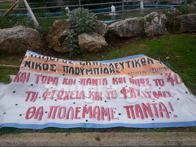Άτομα που ανήκουν στον αντιεξουσιαστικό χώρο πραγματοποίησαν πορεία από την πλατεία Λαού και στη συνέχεια μετέβησαν στην Παναγή Τσαλδάρη και στο σημείο όπου σκίστηκε το πανό. Στις 15.00 ξεκίνησαν και πάλι πορεία προς το σημείο της αφετηρίας τους.