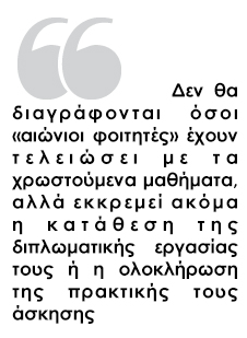 Παράλληλα, όπως έγινε γνωστό, δεν θα διαγράφονται όσοι «αιώνιοι» φοιτητές έχουν τελειώσει με τα χρωστούμενα μαθήματα, αλλά εκκρεμεί ακόμα η κατάθεση της διπλωματικής εργασίας τους ή η ολοκλήρωση της πρακτικής τους άσκησης.