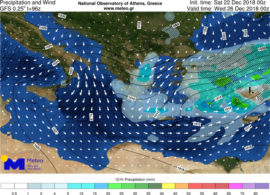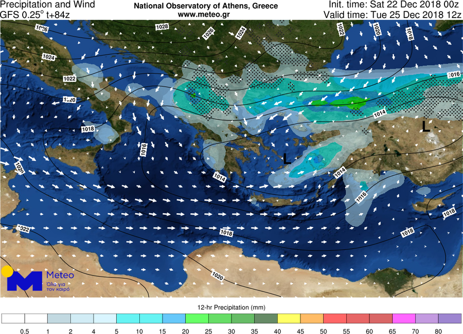 Σύμφωνα με το Εθνικό Αστεροσκοπείο Αθηνών, βροχές, σποραδικές καταιγίδες σε νότιες θαλάσσιες και παράκτιες περιοχές, και χιόνια σε ορεινά και ημιορεινά της ηπειρωτικής χώρας αναμένονται ανήμερα των Χριστουγέννων, καθώς και την δεύτερη ημέρα των Χριστουγέννων, 26/12/2018. Παράλληλα η θερμοκρασία θα παρουσιάσει σημαντική πτώση, ενώ οι άνεμοι στα πελάγη θα φτάνουν τα 7, και πιθανώς τοπικά τα 8 μποφόρ.