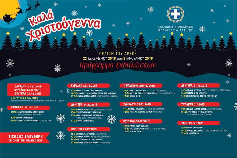 Παράλληλα, στο πλάτωμα μπροστά από το κτήριο Οικονομίδη (το οποίο πρόσφατα επανήλθε στη ζωή), η Περιφέρεια Αττικής φέρνει δράσεις και πολιτιστικά δρώμενα, από τις 22 Δεκεμβρίου έως τις 3 Ιανουαρίου. Ξεφυλλίζοντας το πρόγραμμα των καθημερινών ραντεβού, βρίσκουμε ενδιαφέροντα παιδικά προγράμματα από την Ομάδα Κοπέρνικος (22/12, 24/12) και τον βωβό κωμικό Alex De Paris (30-31/12), εντυπωσιακές ομάδες ακροβατών όπως τους βραβευμένους Cirko Cachivace (22/12, 24/12, 3/1), πολυπολιτισμικές εκδηλώσεις όπως την «Πρωτοχρονιά χωρίς Σύνορα» (23/12) αλλά και μελωδίες από την Καμεράτα – Ορχήστρα Φίλων της Μουσικής (23/12) ή μουσικά παντρέματα από τους Bandallusia (3/1).