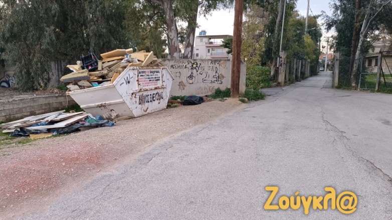 Στην ίδια περιοχή οι δημοτική μεταλλικοί κάδοι (skipper) γεμάτοι μπάζα και ογκώδη αντικείμενα σε πολυήμερη αναμονή μέχρι να απομακρυνθούν από τον δήμο Ελευσίνας.