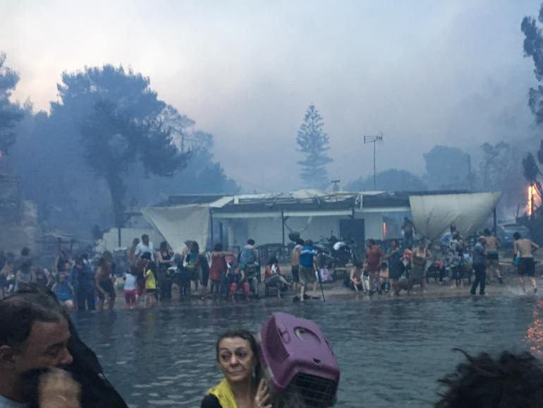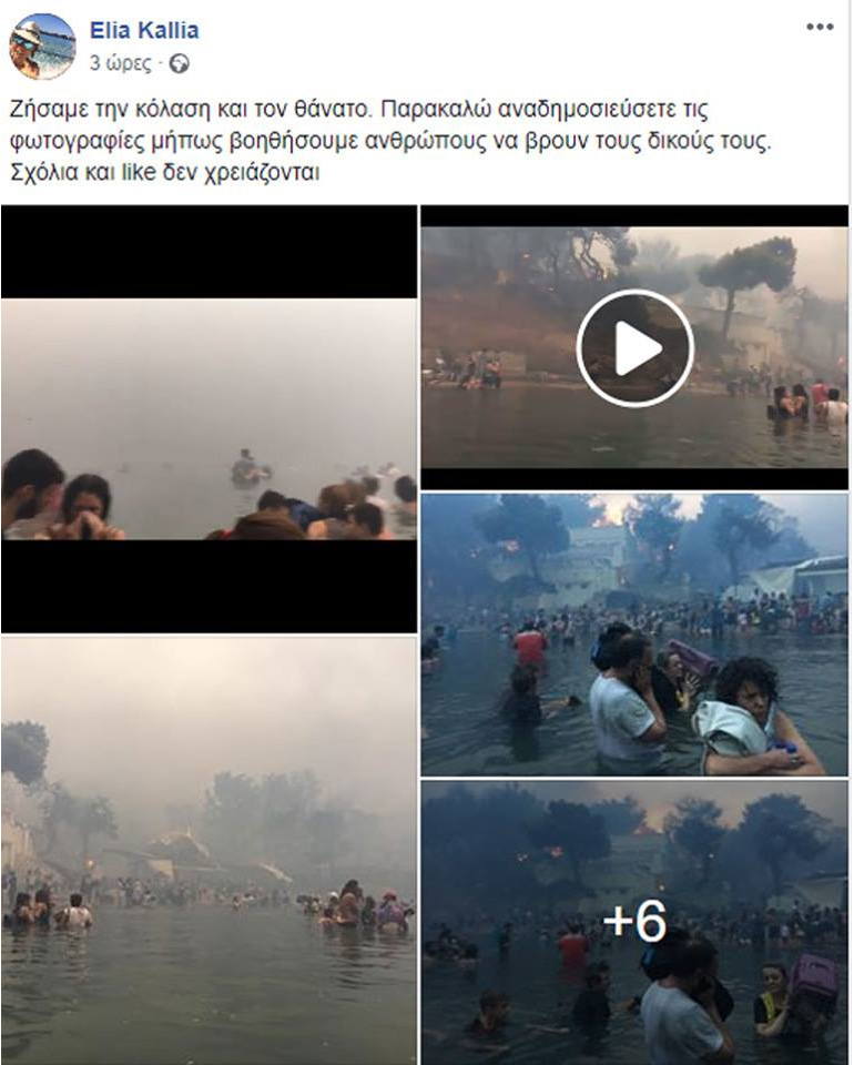 Η κ. Κάλλια ήταν στην περιοχή και μαζί με άλλους συμπολίτες της αλλά και παραθεριστές έτρεξε στη θάλασσα για να σωθεί από την πύρινη λαίλαπα που στην κυριολεξία λίγα μέτρα μακριά τους. Όπως αναφέρει η ίδια στην ανάρτησή της ζητεί την αναδημοσίευση των φωτογραφιών και των videos για να μπορέσουν «οι άνθρωποι να βρουν τους δικούς τους».