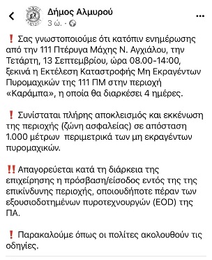 «Σας γνωστοποιούμε ότι κατόπιν ενημέρωσης από την 111 Πτέρυγα Μάχης Ν. Αγχιάλου, την Τετάρτη, 13 Σεπτεμβρίου, ώρα 08.00-14:00, ξεκινά η Εκτέλεση Καταστροφής Μη Εκραγέντων Πυρομαχικών της 111 ΠΜ στην περιοχή «Καράμπα», η οποία θα διαρκέσει 4 ημέρες.