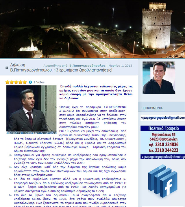 5. Το ίδιο το Συμβούλιο Εφετών αλλά και η Οικονομική Επιθεωρήτρια κα Τσεμπερά τονίζουν ότι ο Σαξώνης υπεξαιρούσε τουλάχιστον από το 1997! Η Θ΄ ΔΟΥ βρήκε υπεξαιρέσεις από το 1993! Πώς, λοιπόν, κατηγορούμαι για «άμεση συνέργεια» εγώ ο οποίος ορκίστηκα δήμαρχος το 1999;