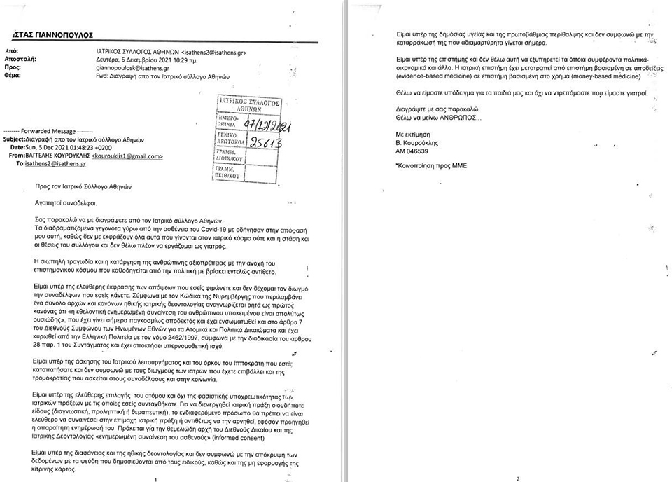 Σας παρακαλώ να με διαγράψετε από τον Ιατρικό σύλλογο Αθηνών. Τα διαδραματιζόμενα γεγονότα γύρω από την ασθένεια του Covid-19 με οδήγησαν στην απόφασή μου αυτή, καθώς δεν με εκφράζουν όλα αυτά που γίνονται στον ιατρικό κόσμο ούτε και η στάση και οι θέσεις του συλλόγου και δεν θέλω πλέον να εργάζομαι ως γιατρός.