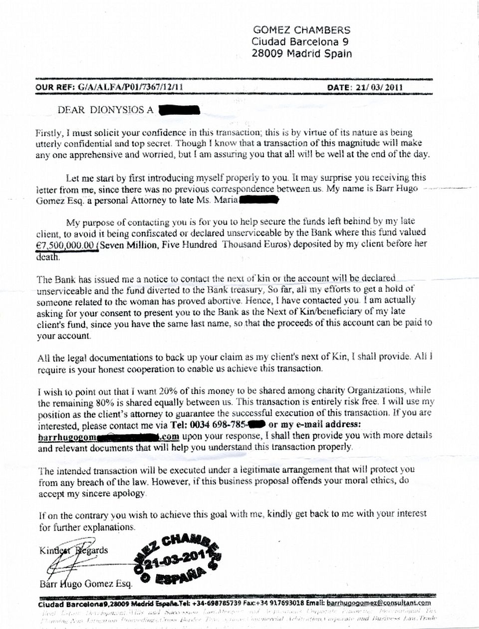 Το μόνο που έχεις να κάνεις, σύμφωνα με τις οδηγίες της επιστολής, είναι να επικοινωνήσεις με το δικηγορικό γραφείο που χειρίζεται την υπόθεση, να δώσεις τα προσωπικά σου στοιχεία και κάτι… ψιλά, κι από κει και πέρα η κληρονομιά είναι δική σου.
