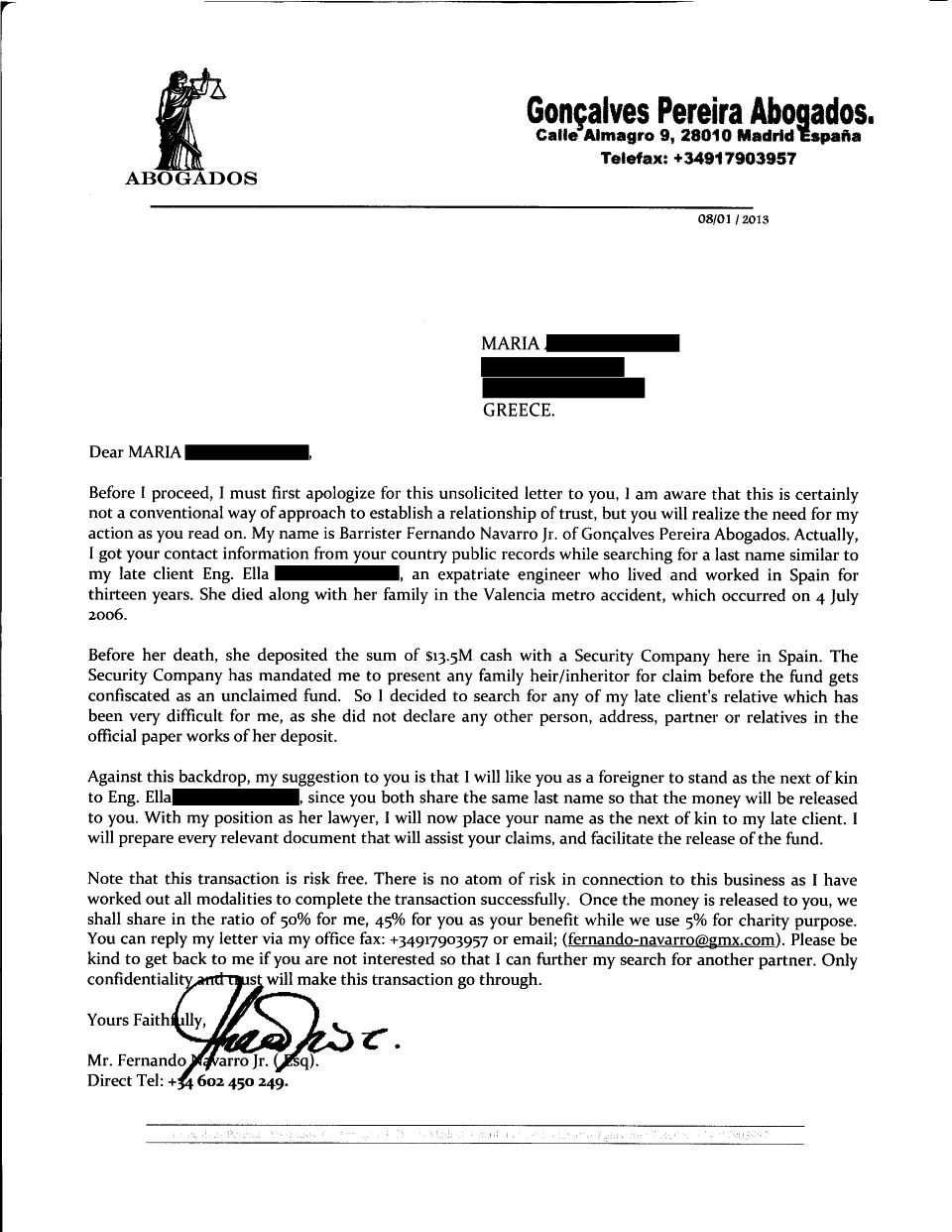 Οι επιτήδειοι στέλνουν επιστολή με τα στοιχεία πολύ γνωστού δικηγορικού γραφείου της Μαδρίτης στο υποψήφιο θύμα. Σ’ αυτήν αναφέρουν ότι πελάτης της εταιρείας τους ήταν ένας συνονόματος ή απλώς μακρινός συγγενής του παραλήπτη.