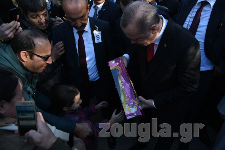 Ο Ερντογάν μοιράζει δώρα σε παιδιά που βρίσκονται στο προαύλιο του μειονοτικού σχολείου: