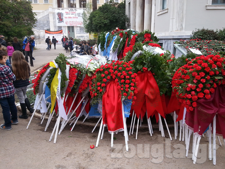 Αυξημένη είναι η προσέλευση του κόσμου στους χώρους του Πολυτεχνείου. Γονείς, κρατώντας τα παιδιά τους από το χέρι, αφήνουν ένα λουλούδι, ενώ φοιτητές συζητούν μεταξύ τους για τα γεγονότα εκείνης της ταραγμένης περιόδου και τη σύνδεσή τους με το σήμερα. Στεφάνια με λουλούδια, κομμάτια χαρτί με λόγια αληθινά, καθώς και παιδικές ζωγραφιές είναι ορισμένοι μόνο από τους τρόπους με τους οποίους ο απλός κόσμος εκφράζει την ευγνωμοσύνη του για εκείνους που θυσίασαν τη ζωή τους στο Πολυτεχνείο.